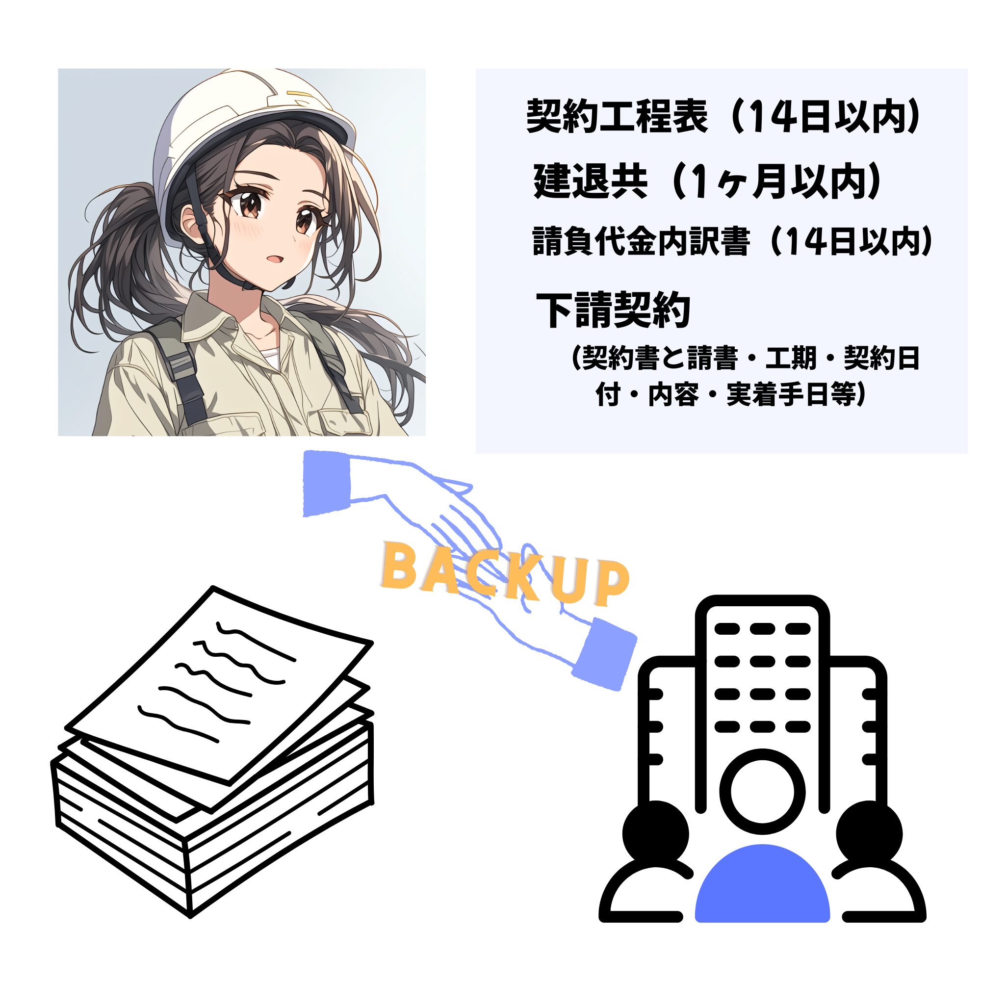 ・契約の初期段階での提出資料、ほとんどが期日があります。契約工程表(14日以内)・建退共(1ヶ月以内)・請負代金内訳書(14日以内)、これら以上につまづきやすいのは、施工体台帳の下請契約です(契約書と請書・工期・契約日付・内容・実着手日等の整合)。工事初期の段階に書面に不備があって、印象ダウン、減点理由となっては、あまりにも現場代理人が気の毒です。このような資料は、あきらかに店社マターの典型でしょう。